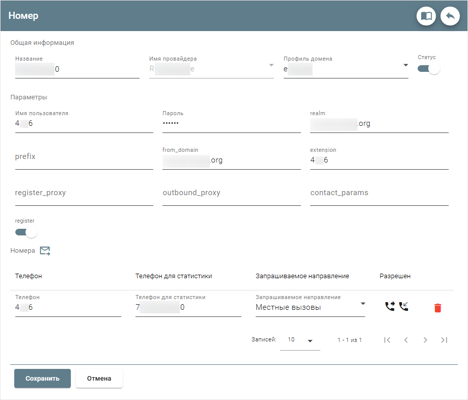 Необходимо заполнить поля с названием и выбрать из списка нужного провайдера, а также выставить статус номера.